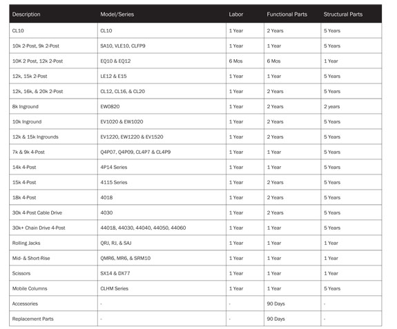 Note: Warranty registration must be completed online at https://www.challengerlifts.com/register-your-lift/ or warranty period will beging from invoice date of lift purchase.